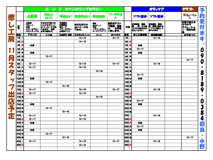 2025年11月 占い、ボディケア、ネイルの出店スケジュール