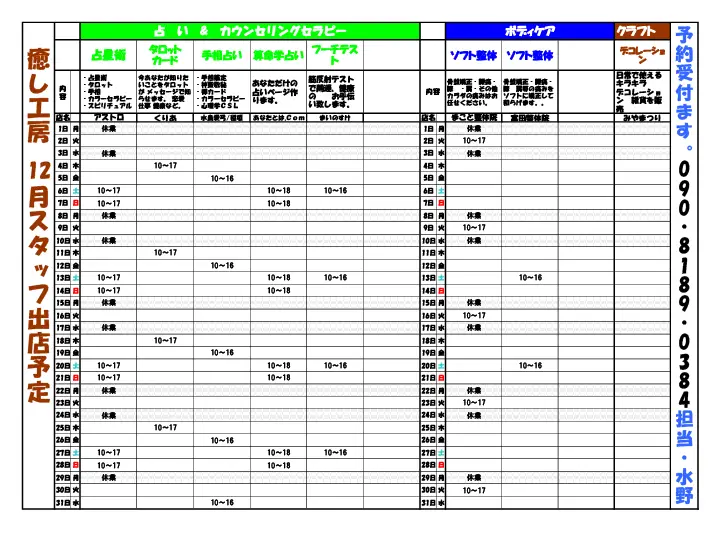2025年12月 占い、ボディケア、ネイルの出店スケジュール