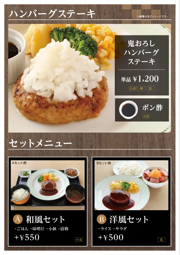 | 料金 | ハンバーグ通常メニュー 1,100円~ キッズメニュー 800円~ |