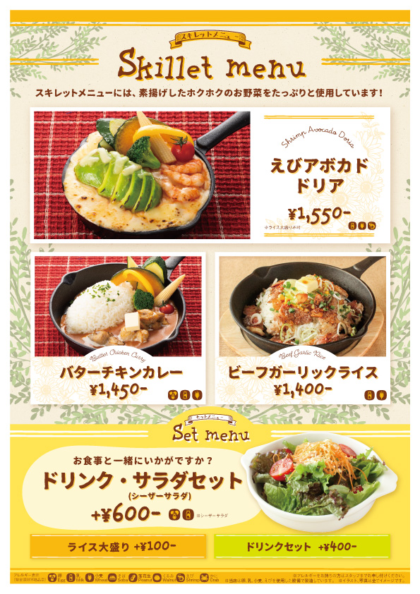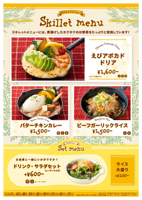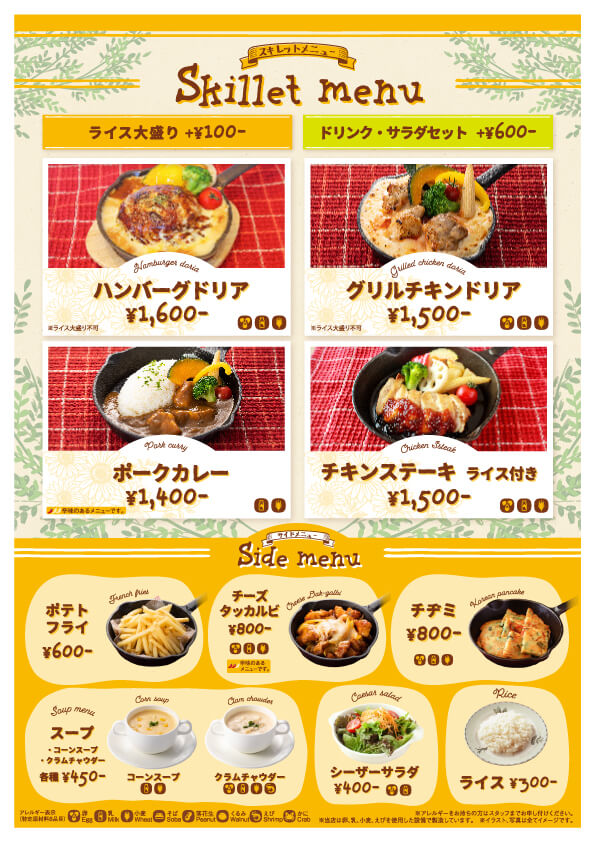 | 料金 | スキレット料理通常メニュー 1,350円~ スイーツメニュー 300円~ |